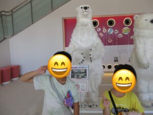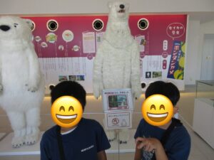 見学を終えると、アイスの試食してロビーで歴代の白熊くんと写真撮影をしました😆