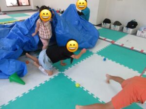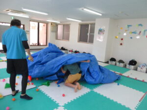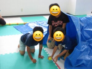 ブルーシートの下に隠された印の付いたカラーボールを探し出すという遊びです。