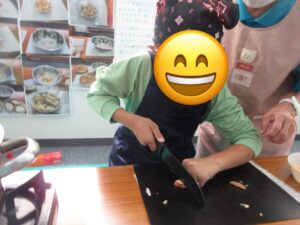 次は、包丁で芋を切りました。包丁を持たない手は、切らないように指をねこ😸の手にしました。