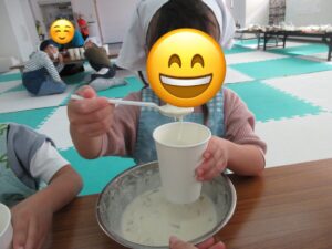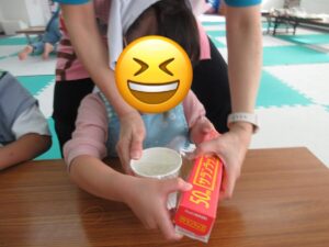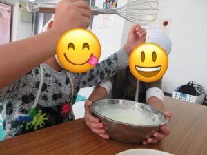 次は、ホットケーキミックスを計って、水を入れて混ぜまーす。