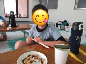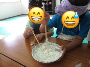 水を計って団子の粉を混ぜまーす。少しなじんできたら