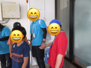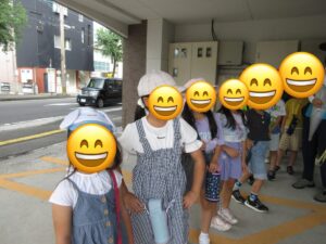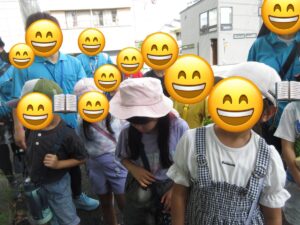 会館につくと海抜の説明や災害の種類の説明などしました。暑い中真剣に聞いていました👏