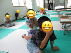 教室に戻ってからは、再度避難訓練の流れの確認をしました。体勢を低くし口にハンカチをつけるなど、学校でも経験しているのでとても上手にできておりました。
